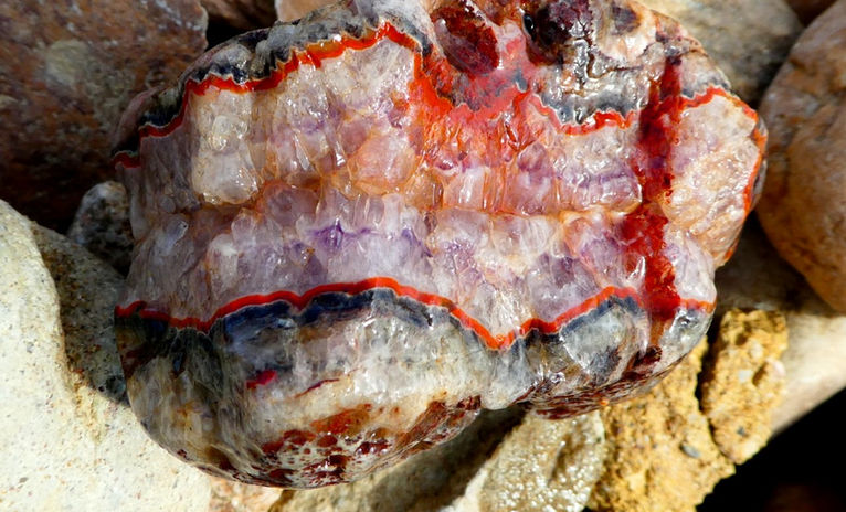 Begonnen wurde die Suche bei der Elbekies GmbH in Mühlberg. Die zwar zum Vortag etwas reduzierte Gruppe wurde recht schnell fündig. Die „Fundliste“ füllte sich: honigfarbener Chalcedon, z. T. größere Amethyste, sehr schöne Achat/Amethyst-Kombinationen aus dem Osterzgebirge, Achat aus Böhmen, blutrot gefärbte Jaspise, bunte verkieselte Hölzer. In einem Stück Elbsandstein tauchte ein Muschelabdruck auf. Über die genannten Funde hinaus hatten die Sammler auch einen Blick für seltenere bzw. unüblichere Funde. Einen mit Spannung erwarteten Sägeschnitt wert waren uns interessante kreisförmige Hornsteinbildungen, Rhyolith mit Achat, ästhetisch ansprechende Gangbrekzien und verkieselte Tuffe (Ignimbrit).