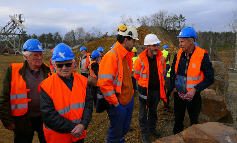 Im Rahmen einer Betriebsführung können wir am Rand des Steinbruchs auch einen Eindruck von dessen riesigen Ausmaßen gewinnen: Die Tagebaufläche hat eine Nord-Süd-Ausdehnung von etwa 1000 Metern und eine Ost-West-Ausdehnung von etwa 800 Metern, das entspricht etwa 55 Hektar oder der Größe von 77 Fußballfeldern…
